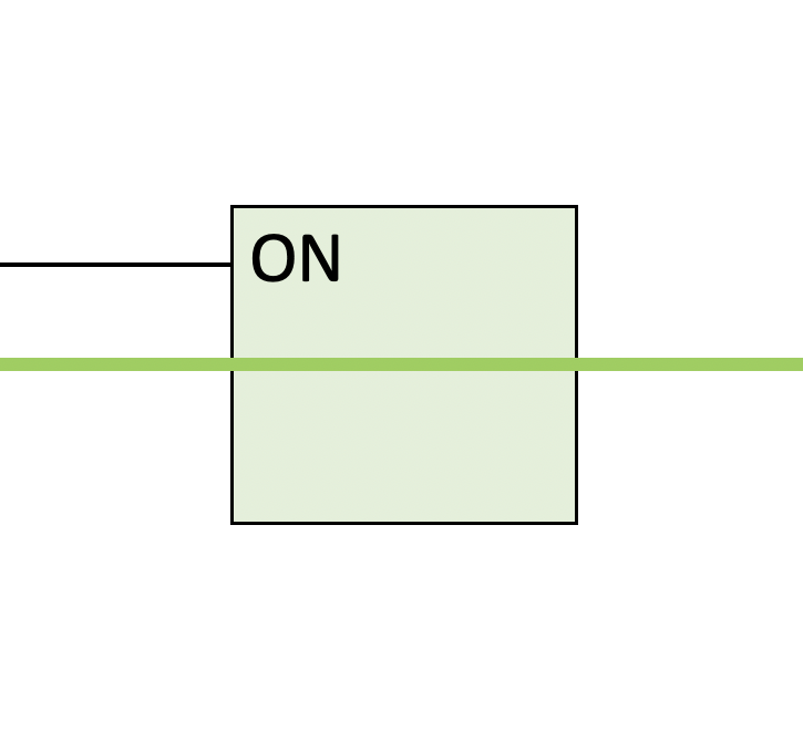 FIGURE 3 illustrates a PMOS transistor as a box with three wires, the control wire, the input wire and the output wire. As in FIGURE 1, wires with no electrical current (0V) are drawn with a thin black line whereas wires with current (5V) are drawn with a thick green line. The control wire determines the conductivity of the transistor, essentially opening and closing the switch. The diagram shows the transistor in its default state (with 0V on the control wire). which is conductive (labeled ON). The current entering on the input wire is able to flow through the transistor and out the output wire. If you select 5V on the control wire, this will flip the transistor to its nonconductive state (labeled OFF). The current entering along the input wire is blocked and thus no current reaches the output wire.